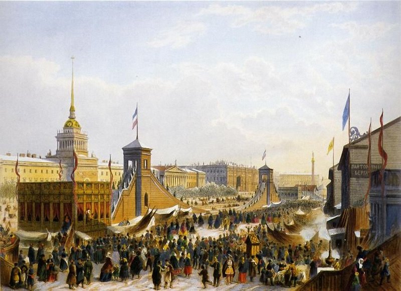 Адмиралтейская площадь во время Масленицы. Литография Ж. Жакотте и Обрэна с оригинала И. И. Шарлеманя. 1850-е гг.