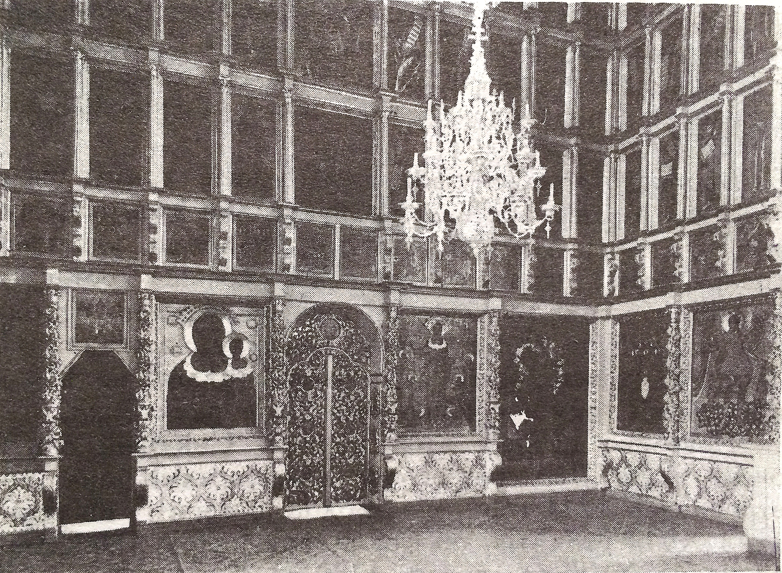 Иконостас церкви Иоанна Богослова, фото А. Н. Павловича из книги Г. К. Лукомского «Вологда в её старине», 1914 г. В местном ряду крайняя справа — та самая икона Архангела Михаила